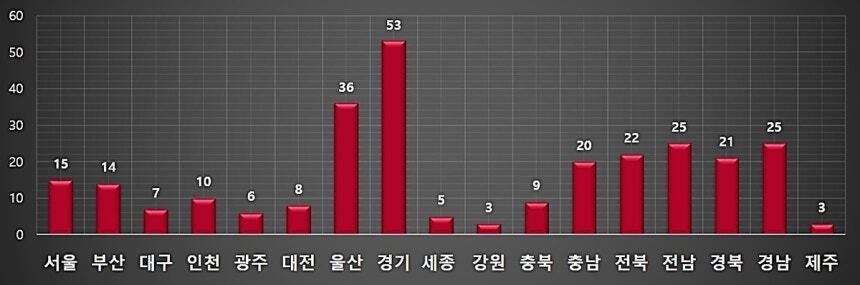 지역별로 보면 산업단지가 밀집한 경기에서 가장 많은 53건의 화학사고가 발생했다. 그 뒤는 울산 36건, 경남 25건, 전남 25건, 전북 22건, 경북 21건 순이었다.