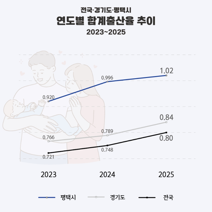 26일 평택시에 따르면 국가통계포털이 발표한 2025년 잠정 합계출산에서 평택시는 2024년 0.996에서 2025년 1.02로 올라 다시 1.0명을 넘어섰다. 2023년(0.92) 이후 2년 연속 상승이다.