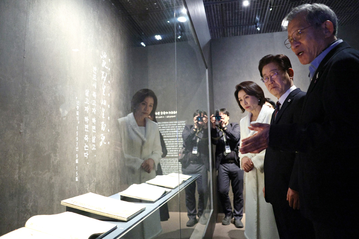 이재명 대통령과 김혜경 여사가 26일 서울 용산구 국립중앙박물관에서 열린 '우리들의 이순신' 특별전에서 난중일기를 관람하고 있다. |