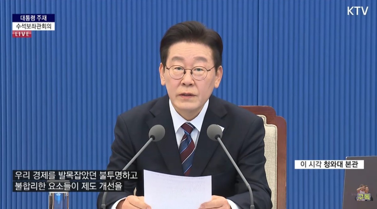 이재명 대통령이 26일 청와대에서 제25차 수석보좌관회의를 주재하며 발언하고 있다. [사진=KTV] |