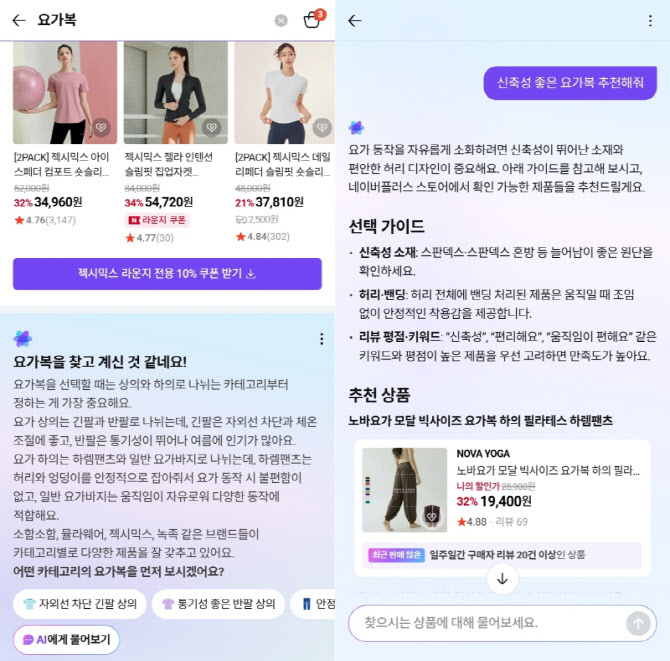 사용 방식은 간단하다. 최신 버전으로 업데이트한 네플스 앱에서 상품을 검색하면 AI가 반응하며 쇼핑 가이드를 띄운다. 예를 들어 ‘요가복’을 검색하면 “요가복을 찾고 계신 것 같네요!”라는 문구와 함께 가이드가 활성화되고, 통기성·활동성 등 구체 정보가 궁금할 때 ‘AI에게 물어보기’를 선택하면 대화형 추천이 시작된다.