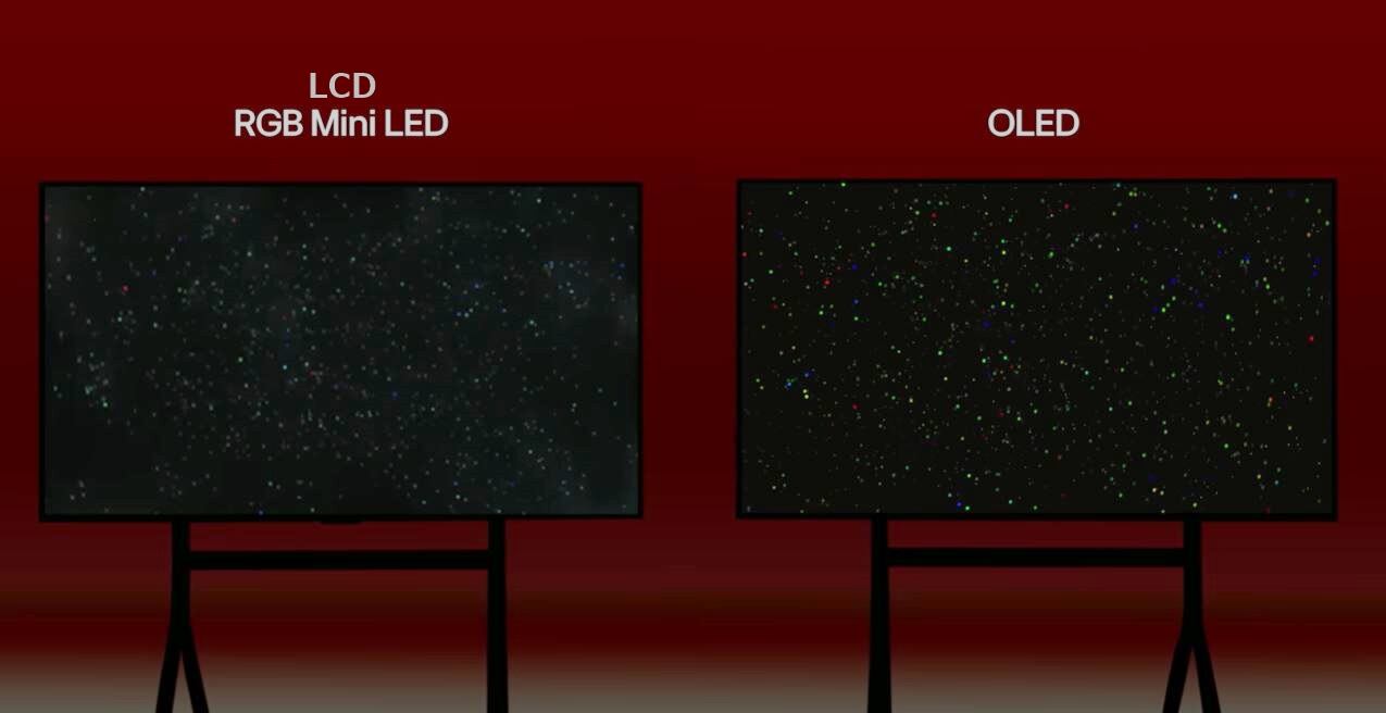 픽셀 단위로 빛을 내는 유기발광다이오드(OLED) TV 패널(오른쪽)과 블록 단위로 빛을 내는 LCD TV 패널 비교./LG디스플레이