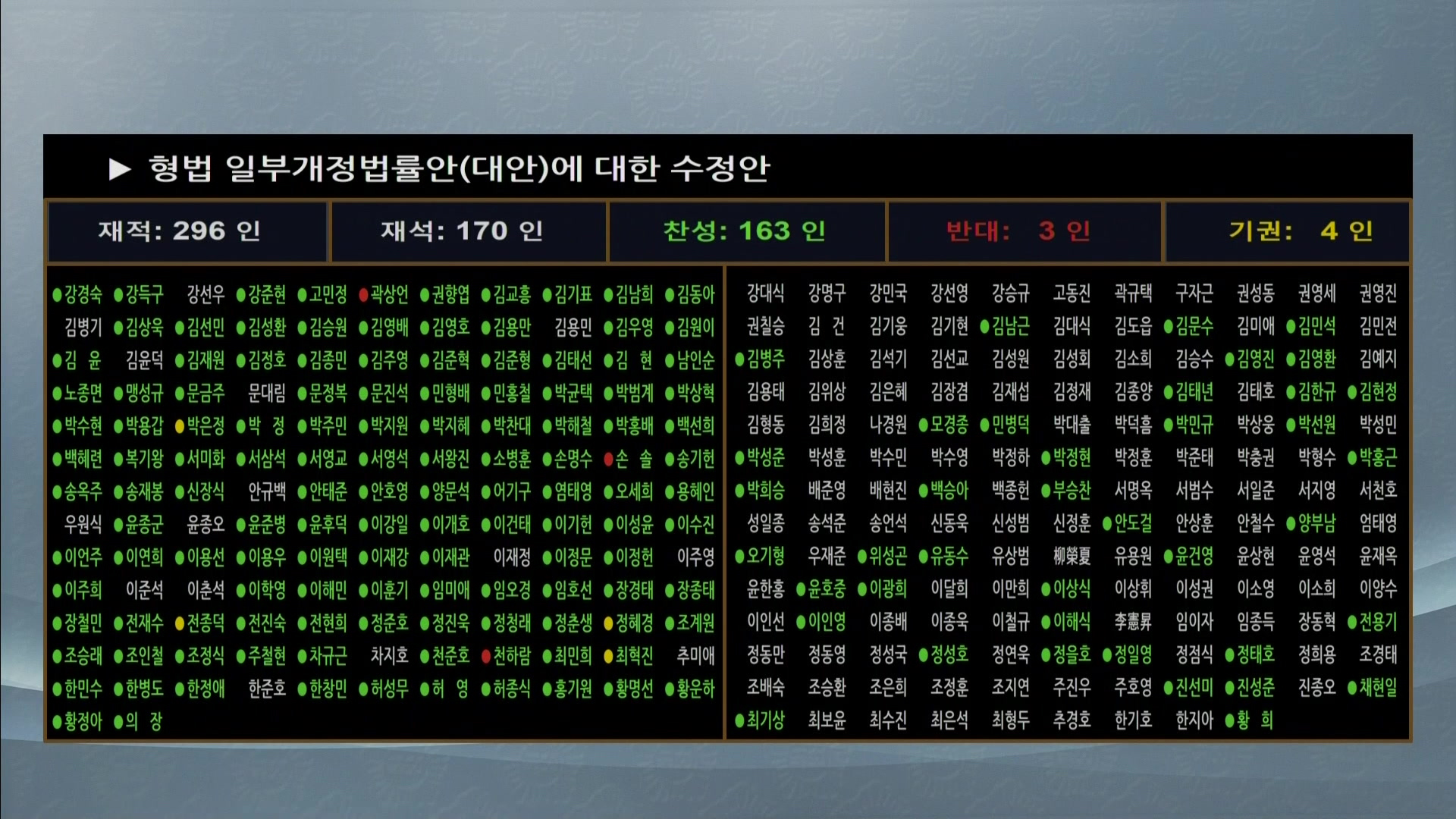 찬성 163표·반대 3표·기권 4표로 가결