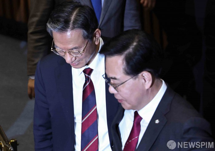 [서울=뉴스핌] 윤창빈 기자 = 송언석 국민의힘 원내대표, 정성호 법무부 장관이 26일 오후 서울 여의도 국회에서 열린 본회의에서 대화하고 있다. 2026.02.26 pangbin@newspim.com