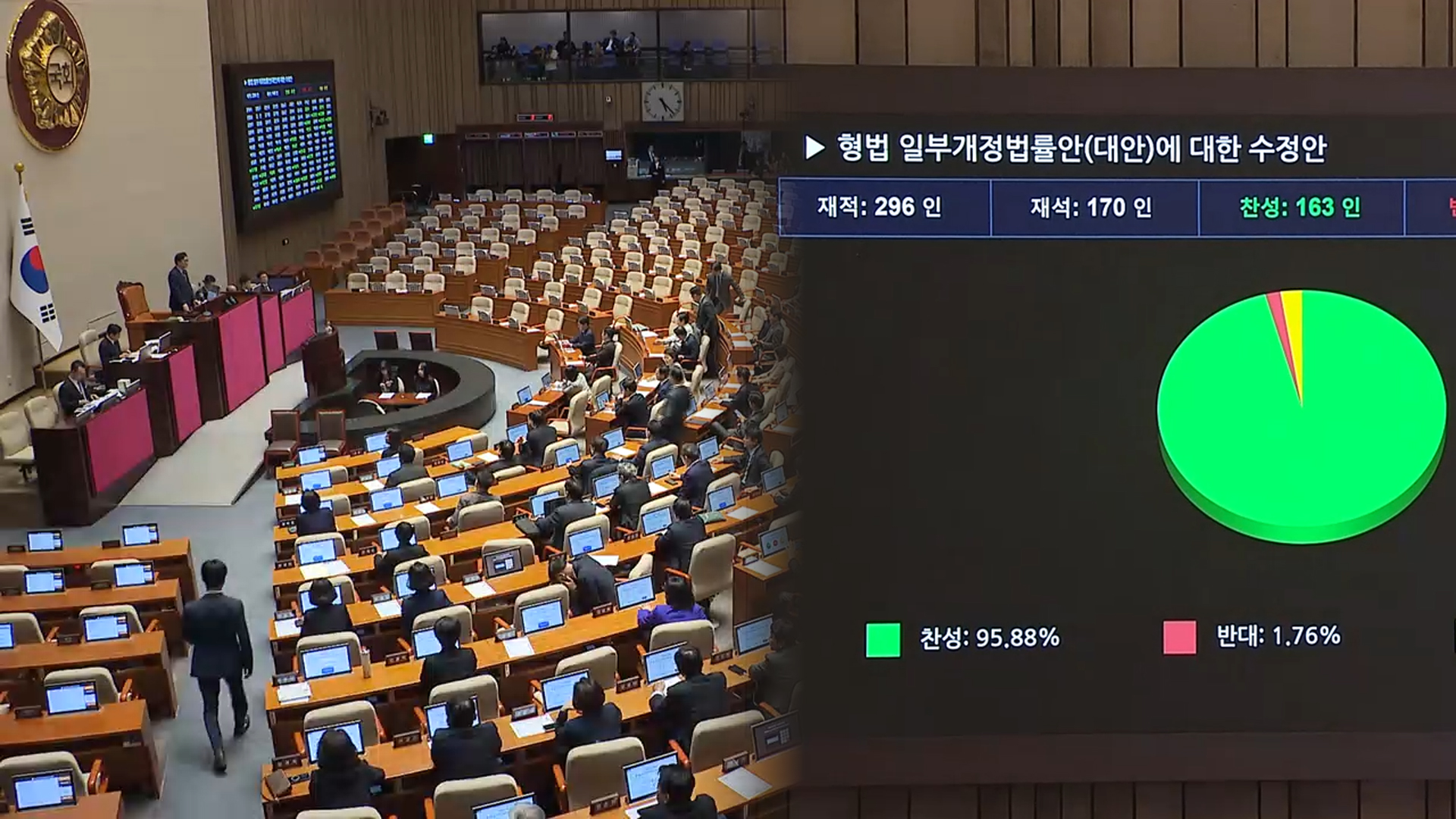 <우원식 / 국회의장> "재석 170인 중 찬성 163인, 반대 3인, 기권 4인으로써 형법 일부 개정법률안 대안에 대한 수정안은 가결되었음을 선포합니다."