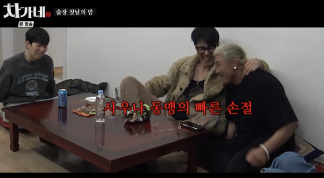 [OSEN=김수형 기자] ‘차가네에서 사우나로 단합(?)에 나선 딘딘과 추성훈이 차승원을 둘러싼 ‘배신 케미’로 웃음을 자아냈다.