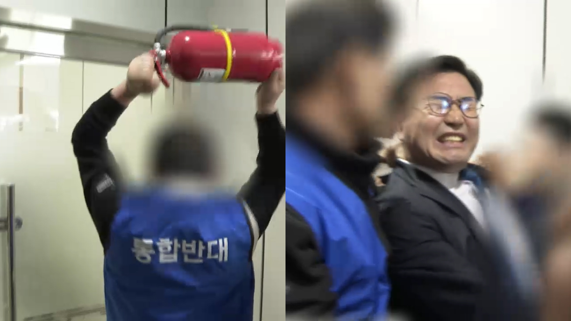 경찰까지 출동하며 갈등이 커지는 상황에 잠시 문이 열리자 마찰은 더욱 거세졌고 아수라장을 방불케 했습니다.