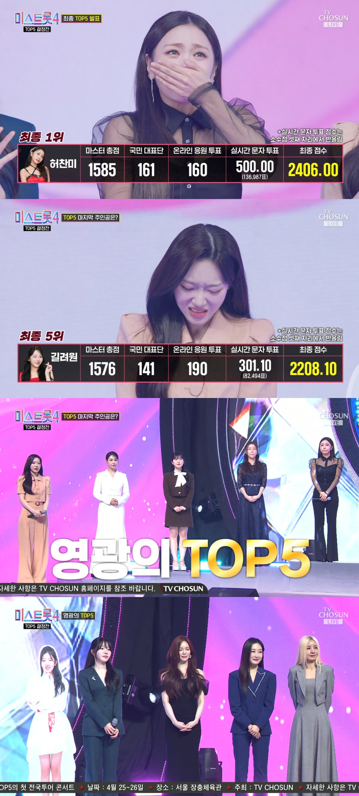 최종 결정된 TOP5 허찬미, 이소나, 홍성윤, 윤태화, 길려원은 다음 주 4대 미스트롯을 가리는 결승전을 치를 예정이다.