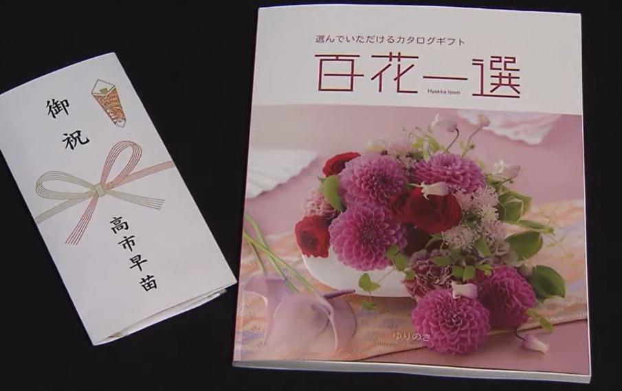 다카이치 사나에 일본 총리가 8일 중의원 선거에서 당선된 자민당 의원 전원에게 나눠준 ‘카탈로그 기프트’. 3만3990엔(약 31만 원) 상당의 선물을 골라 배송받을 수 있게 했다. 동봉된 메모지(왼쪽)에 ‘축하 다카이치 사나에’라고 쓰여 있다. 니혼TV 유튜브 캡처 |