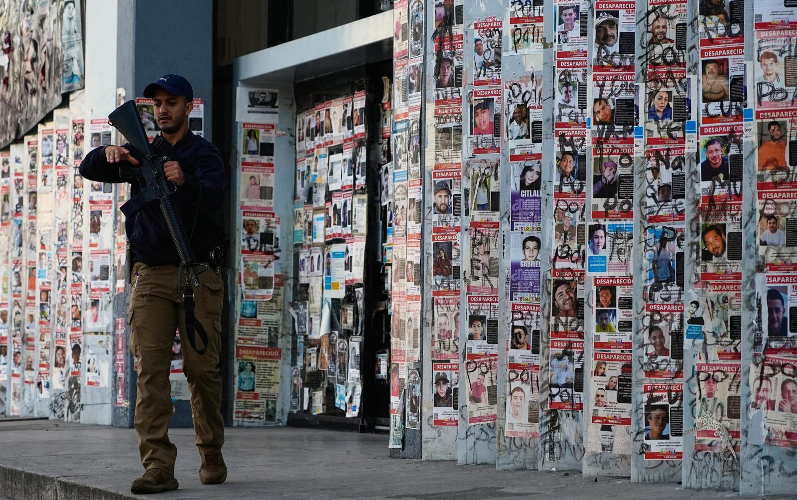 25일 멕시코 과달라하라에서 실종자를 찾기 위해 당국이 마련한 건물을 무장 경찰이 지키고 있다. 인신매매, 납치, 실종 등이 빈번한 멕시코에서는 최근 ‘엘 멘초’라는 별명으로 악명 높은 마약왕 네메시오 오세게라 세르반테스가 당국에 사살된 후 치안 불안이 더 커졌다. 오세게라의 죽음에 분노한 마약 카르텔들이 곳곳에서 방화, 약탈 등을 저지르고 있다.