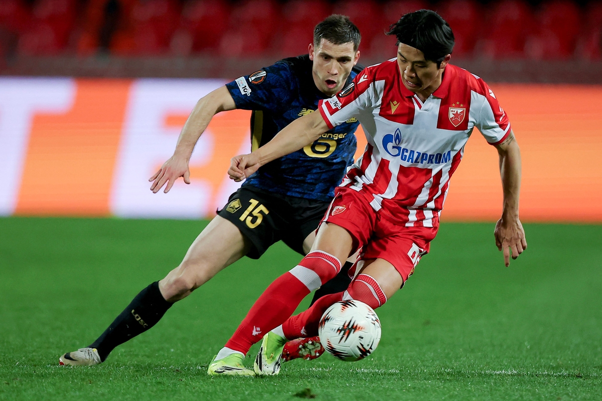 즈베즈다의 설영우가 27일 릴과의 유로파리그 16강 플레이오프 2차전 홈경기에서 드리블하고 있다. AFP연합뉴스 |