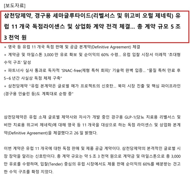 삼천당제약은 지난 26일 공시와 보도자료를 통해 자사가 개발 중인 경구용 GLP-1(당뇨 치료용 리벨서스 및 비만 치료용 위고비 제네릭)에 대해 영국 등 유럽 11개국을 대상으로 하는 독점 라이센스 및 상업화 본계약(Definitive Agreement)을 체결했다고 밝혔다.회사는 보도자료에서 “총 계약 규모는 약 5조3000억원으로 계약금 및 마일스톤으로 총 3000만 유로를 수령하며 입찰(Tender) 중심의 유럽 시장에서도 제품 판매 순이익의 60%를 배분받는 견고한 수익 구조를 확정 지었다”고 설명했다.