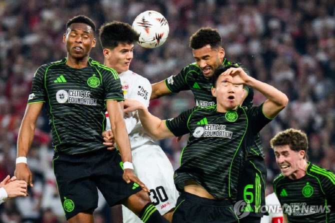 슈투트가르트와 경기에서 공중볼 다툼에 참여한 셀틱 양현준(오른쪽에서 두 번째).(사진=AP/연합뉴스) |