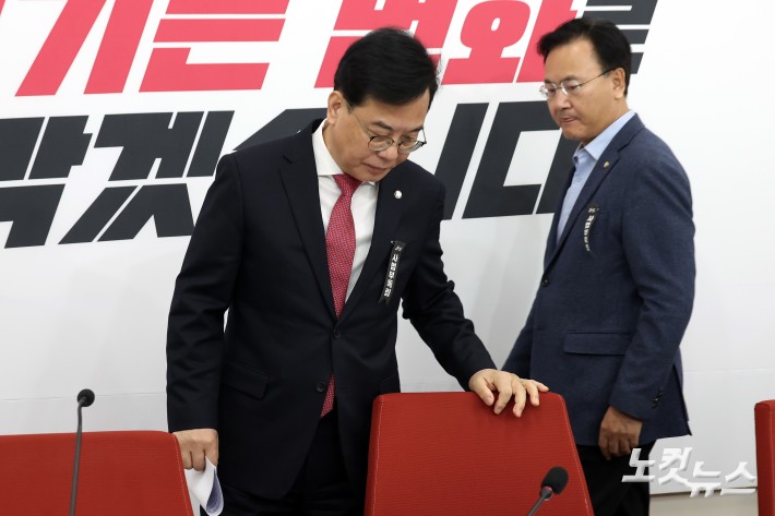 국민의힘 송언석 원내대표가 27일 서울 여의도 국회에서 열린 기자간담회에 참석하고 있다.