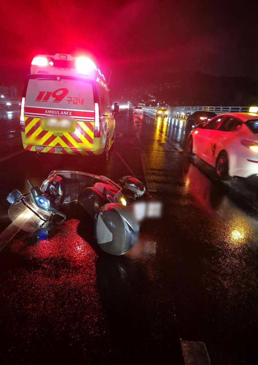 부산 구포대교에서 빗길에 넘어진 오토바이 운전자가 차량에 치여 숨지는 사고가 났다.