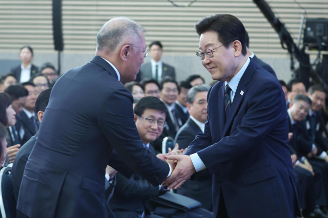 ▲이재명 대통령이 27일 전북 군산새만금컨벤션센터에서 열린 새만금 로봇·수소·AI 시티 투자협약식에서 축사를 마친 뒤 정의선 현대차그룹 회장과 악수하고 있다. ⓒ연합뉴스