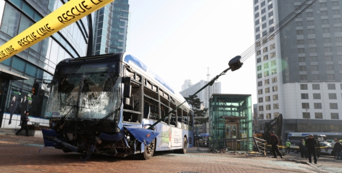 지난달 16일 오후 서울 서대문구 서대문역사거리에서 버스가 인도로 돌진한 사고가 발생해 경찰과 소방당국이 현장 수습을 하고 있다. /사진=뉴시스. |