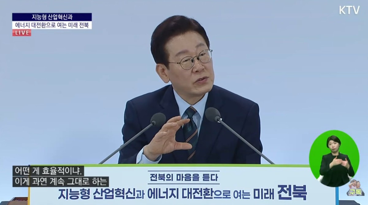 이재명 대통령이 27일 전북 전주시 전북대학교에서 열린 '전북의 마음을 듣다' 타운홀미팅 간담회에서 발언을 하고 있다. [사진=KTV] |