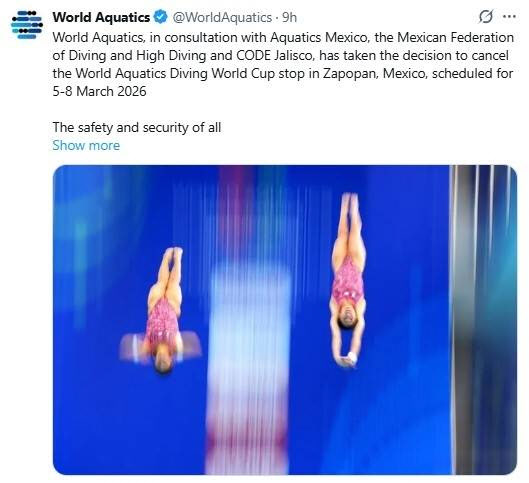 세계수영연맹은 26일 “멕시코수영연맹 등과 협의해 3월 5~8일 멕시코 사포판에서 개최하려던 다이빙 월드컵을 취소하기로 결정했다”고 발표했다.