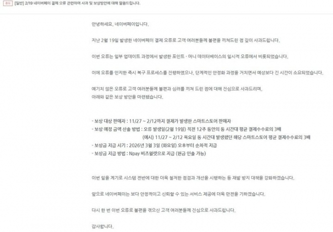 네이버페이, 스마트스토어 결제 오류 보상…“동 시간대 수수료 3배 지급”