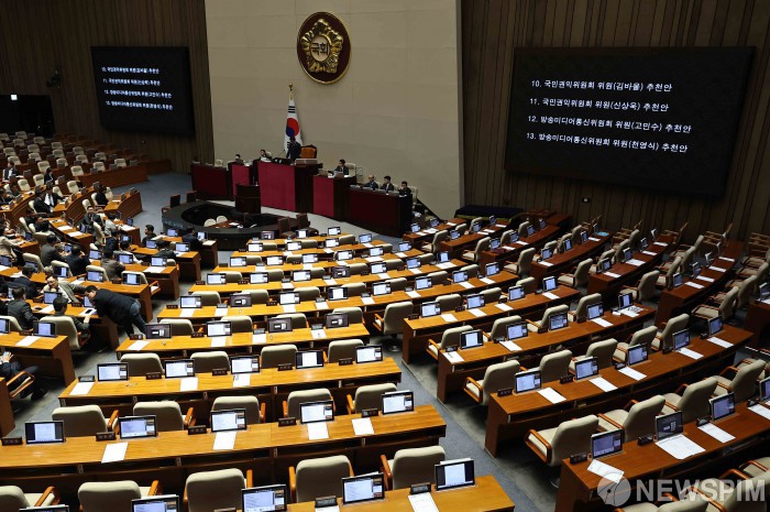 천서울=뉴스핌] 윤창빈 기자 = 26일 오후 서울 여의도 국회에서 열린 본회의에서 국민의힘이 추천한 천영식 방송미디어통신위원회 상임위원 추천안 등이 상정되고 있다. 이날 천영식 방미통위 상임위원 추천안은 부결 되었다. 2026.02.26 pangbin@newspim.com |