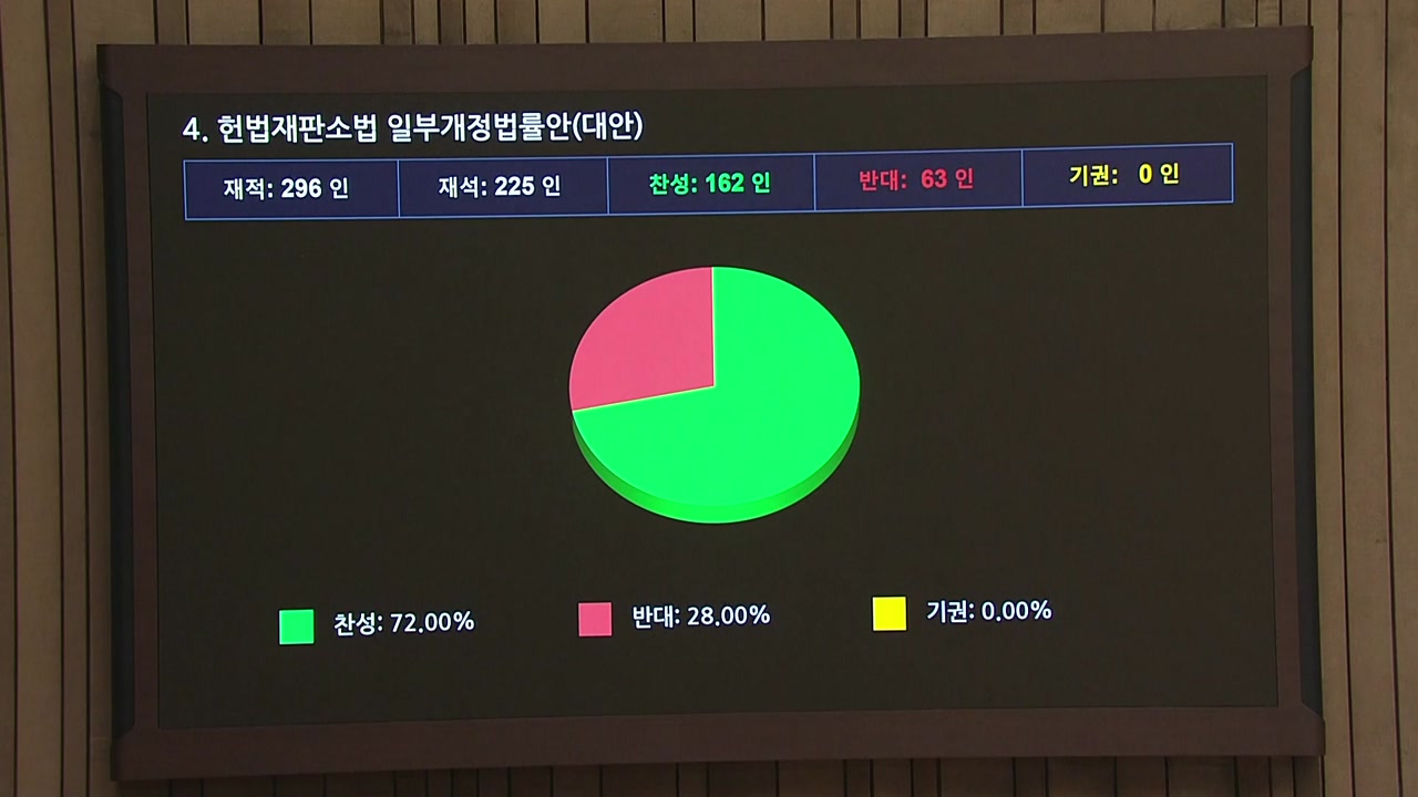 재석 225인 중 찬성 162인, 반대 63인으로써 헌법재판소법 일부개정법률안 대안은 가결되었음을 선포합니다.