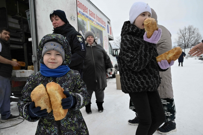 19일(현지시간) 우크라이나 키이우주 보로댠카의 한 임시 거주지에서 아이들이 프랑스에서 온 자원봉사 제빵사가 나눠주는 빵을 받고 기뻐하고 있다. 2026.2.19 AFP 연합뉴스 |