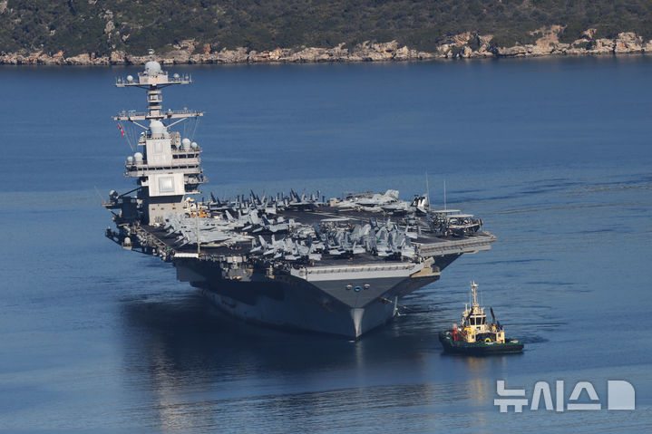 [AP/뉴시스] 26일 사진으로 미국 최대 항공모함인 제럴드 포드 호가 지중해 그리스 크레테섬 차니아의 수다 해군기지를 떠나 이스라엘 쪽으로 가고 있다 |