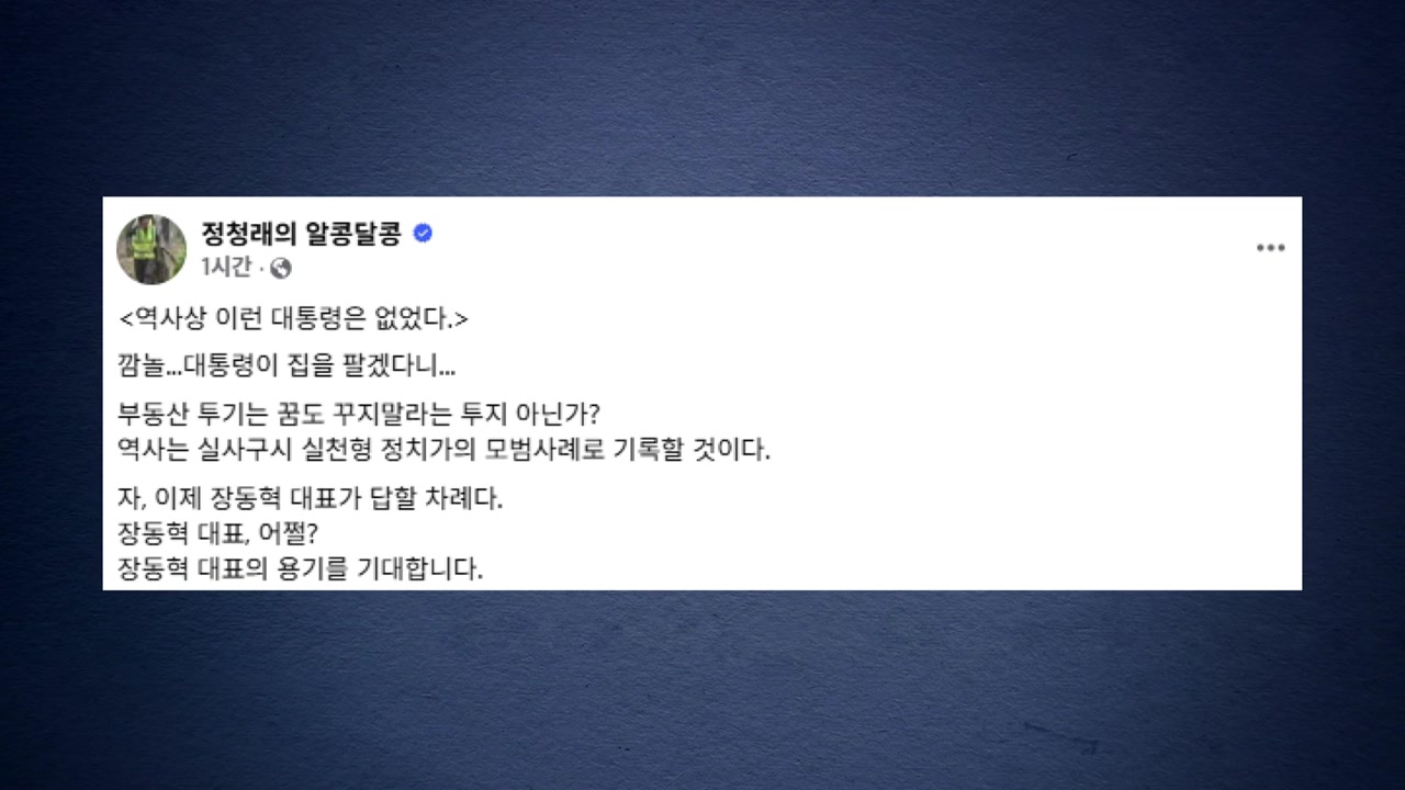 정청래 대표도 SNS에 역사상 이런 대통령은 없었다며, 역사는 실사구시 실천형 정치가의 모범사례로 기록할 것이고, 이제 장 대표가 답할 차례라고 적었습니다.