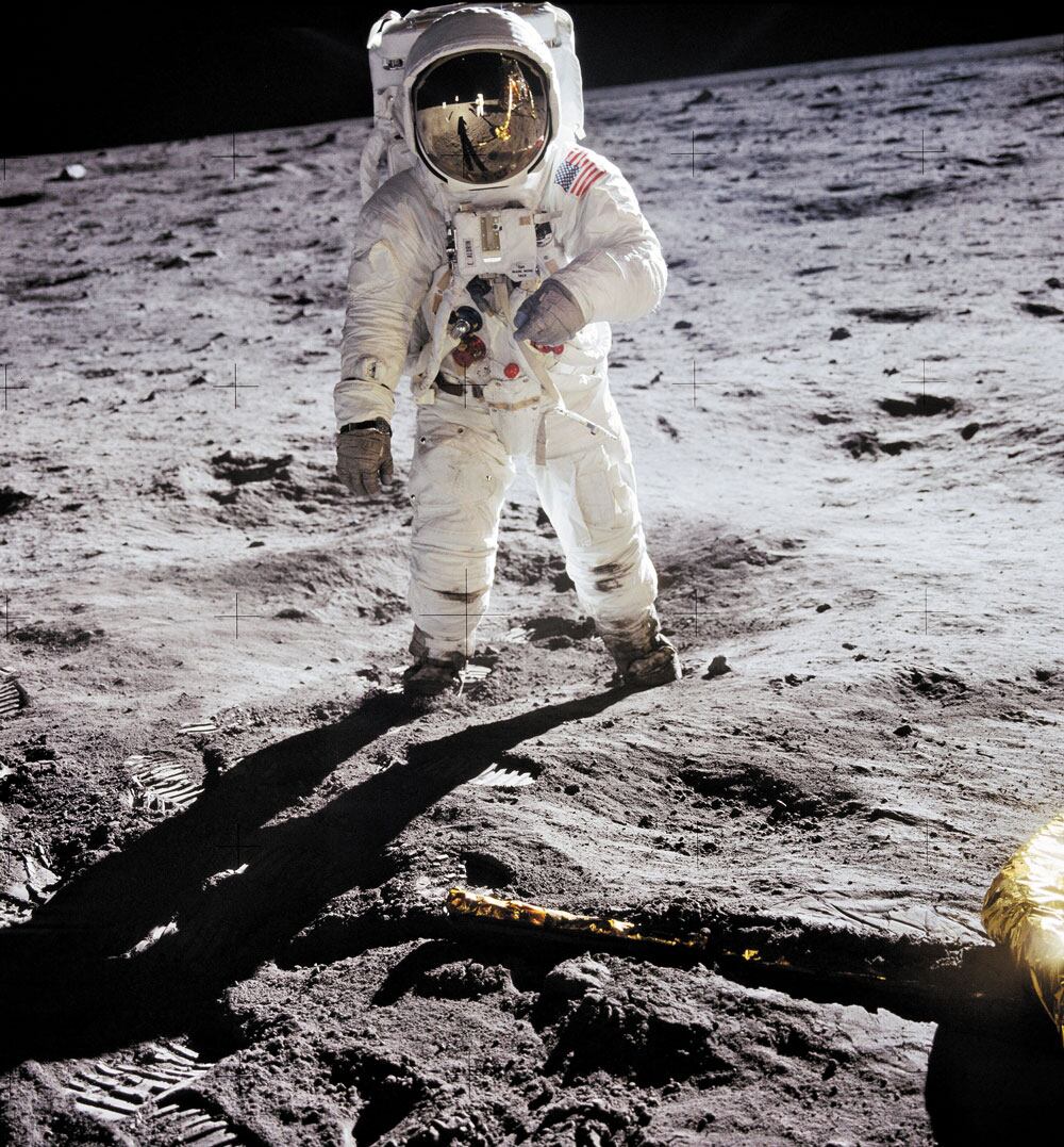 1969년 7월 20일 인류 최초로 달에 착륙한 아폴로 11호의 우주비행사 닐 암스트롱이 동료인 버즈 올드린을 찍은 사진. 올드린의 헬멧 창에 암스트롱과 달 착륙선 이글호가 보인다. /NASA |