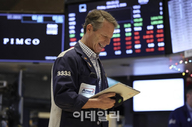 뉴욕증권거래소에서 한 트레이더가 환하게 웃고 있다. (사진=AFP)