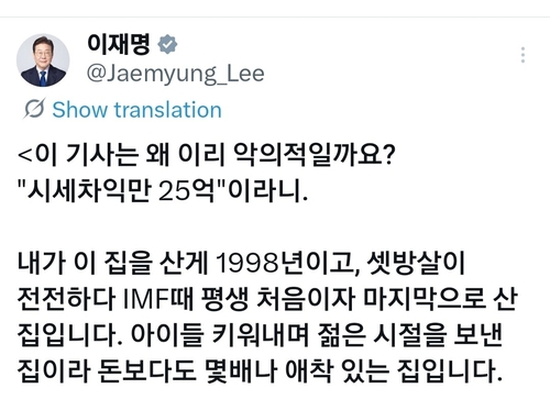 이 대통령은 이날 엑스(X·옛 트위터)에 해당 기사를 링크하며 "개 눈에는 뭐만 보인다는 말이 있다. 내가 부동산 투기를 했다는 이미지를 씌워주고 싶기라도 한 것인가"라고 밝혔다.