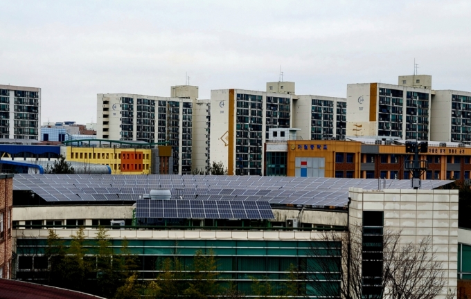 광명시보건소 옆 광명시립노인요양센터 옥상에 설치된 49.5kW 규모의 태양광 패널/사진=권다희 기자 |