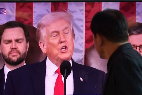 25일 서울역 대합실 TV에 미국 트럼프 대통령의 국정연설이 나오고 있다. 2026.2.25 연합뉴스 |