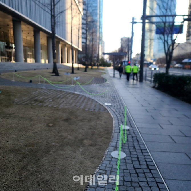 직접 그 공간을 걸어보면 느낌은 사뭇 달라진다. 신용산역 인근 아모레퍼시픽 신사옥 전면 공간처럼 겉으로는 광활하지만, 실제 보행 동선은 의외로 제한적이다. 잔디를 보호한다는 명목의 초록색 체인과 안내 표지, 각종 경계 장치는 이 공간이 자유로운 통과를 전제로 설계된 곳이 아님을 보여준다. 보행자는 넓은 잔디를 가로지르지 못한 채 가장자리의 보도블록을 따라 우회한다. 시각적으로는 열려 있으나 물리적으로는 닫힌 공간이다. 건축선은 후퇴했지만, 발걸음은 확장되지 못했다. 공간은 넓어졌으나 동선은 오히려 축소되었다.