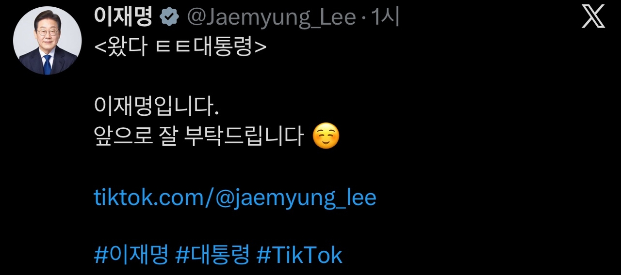 해당 영상에서 이 대통령은 “안녕하세요 틱톡, 이재명입니다”라고 인사를 건네며 “팔로우, 좋아요, 댓글까지 아시죠? 잘 부탁드립니다”라고 전했다.