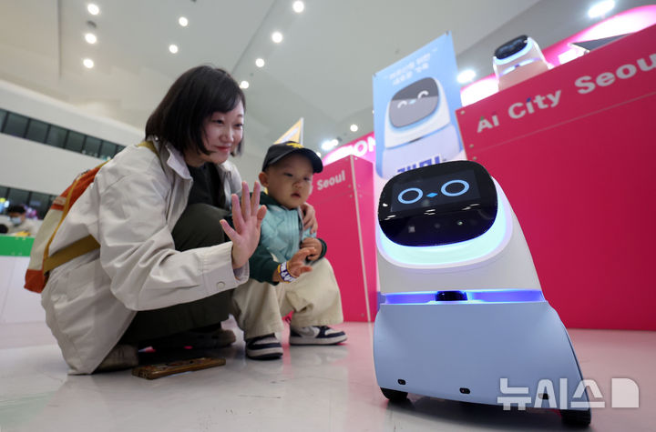 [서울=뉴시스] 김진아 기자 = 28일 서울 중구 동대문디자인플라자(DDP) 아트홀에서 열린 '서울AI페스티벌 2026'에서 엄마와 아이가 가정용 생활 반려로봇 '케미프렌즈'와 인사하고 있다.