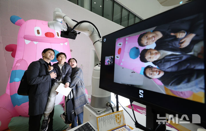 [서울=뉴시스] 김진아 기자 = 28일 서울 중구 동대문디자인플라자(DDP) 아트홀에서 열린 '서울AI페스티벌 2026'에서 한 가족이 AI로봇이 사진을 찍어주는 체험을 하고 있다.