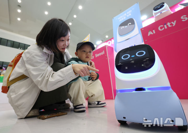 [서울=뉴시스] 김진아 기자 = 28일 서울 중구 동대문디자인플라자(DDP) 아트홀에서 열린 '서울AI페스티벌 2026'에서 엄마와 아이가 가정용 생활 반려로봇 '케미프렌즈'와 인사하고 있다.