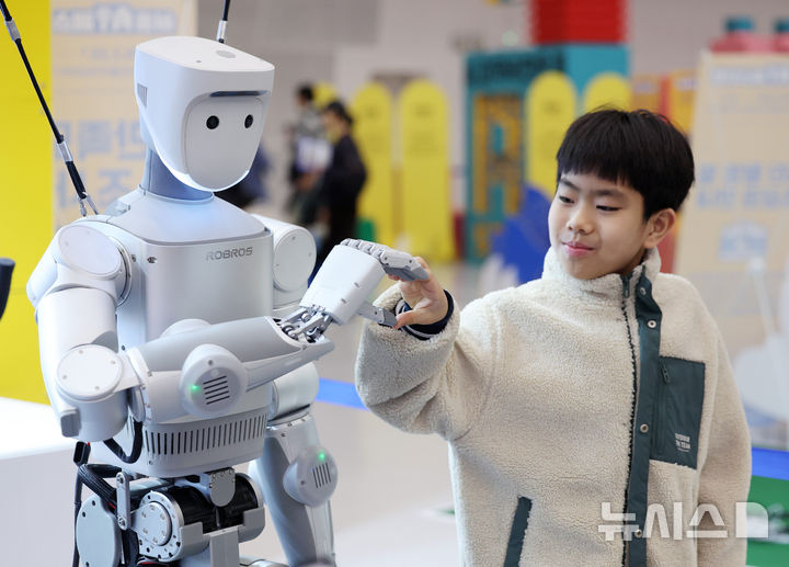 [서울=뉴시스] 김진아 기자 = 28일 서울 중구 동대문디자인플라자(DDP) 아트홀에서 열린 '서울AI페스티벌 2026'에서 한 어린이가 '로브로스'의 휴머노이드 로봇과 손하트를 만들고 있다.