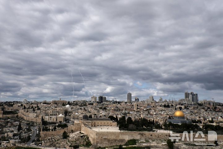 [예루살렘=AP/뉴시스] 정병혁 기자 = 미국이 이란에 대해 군사공격을 강행한 가운데 28일 예루살렘 구시가지 상공에서 미사일 요격 흔적이 보이고 있다. 2026.02.28. |