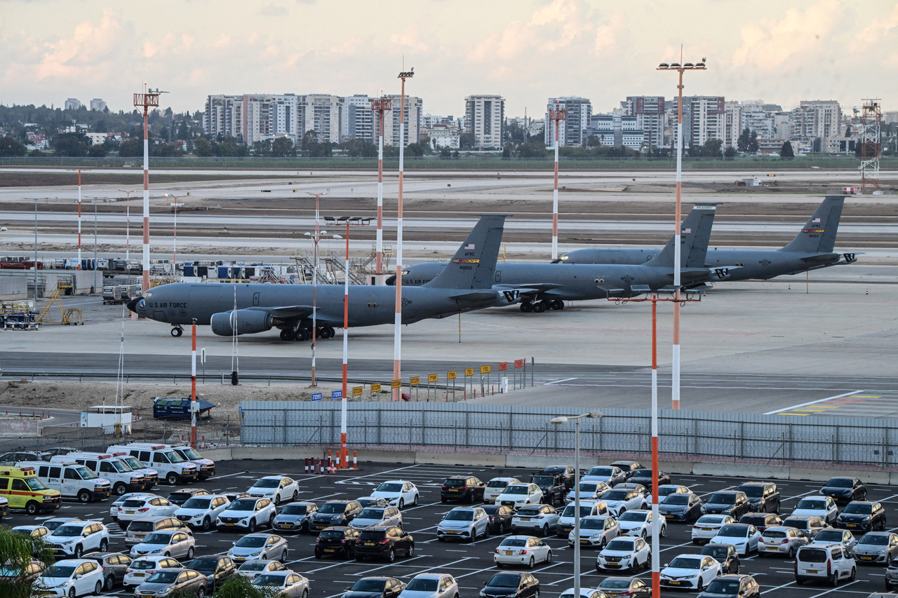 지난 24일(현지시간) 이스라엘 텔아비브 인근 벤 구리온 국제공항에 미 공군 공중급유기들이 일렬로 늘어서 있다. [로이터] |