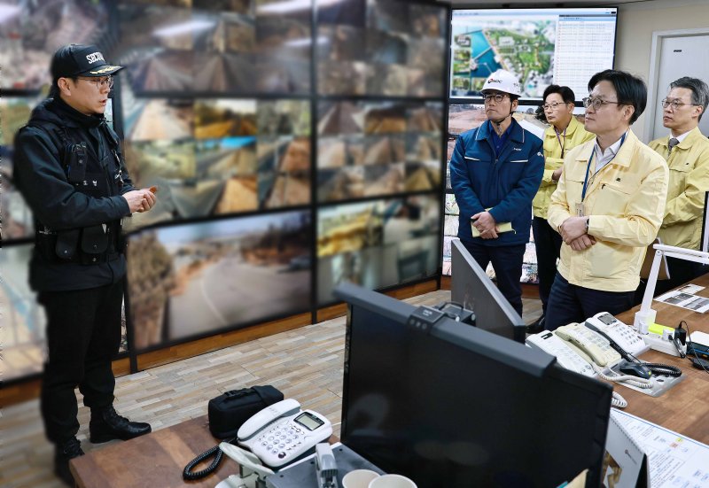 19 김정관 산업통상부 장관이 19일 경기도 평택시 한국석유공사 비축기지를 방문해 재난안전, 시설방호 및 사이버보안 대응 상황을 점검하고 있다. 산업통상부 제공. |