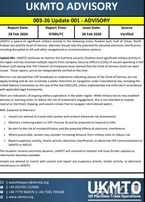 UKMTO는 "광범위한 지역에서 군사 작전이 진행 중이라는 징후가 있다"며 "군이 우발적인 교전 위험을 줄이기 위해 권고 또는 경고 구역을 설정할 수 있으나, 이는 중립국 선박이나 상선의 통행을 방해하려는 의도가 아니다. 선박들은 여전히 국제 해역을 자유롭게 항해할 수 있다"고도 밝혔다.