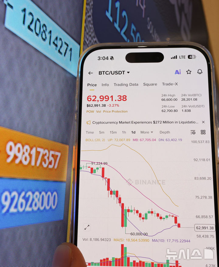 [서울=뉴시스] 28일(현지 시간) 월스트리트저널(WSJ)에 따르면 비트코인 가격은 공습 직후 6만3255달러까지 하락한 뒤 낙폭을 일부 만회해 6만5000달러 안팎에서 거래됐다. 24일 서울 서초구 빗썸라운지 강남본점 전광판에 비트코인 시세가 보이고 있다. 2026.02.28. |