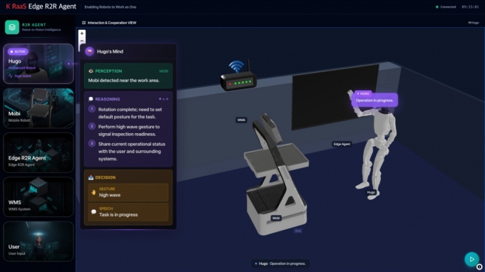 사람의 개입없이 로봇간 자율협업 시나리오도 공개한다. 예컨대 스마트 자동차 공장에서 휴머노이드 로봇 '휴고'(Hugo)가 VLA 기반으로 부품 이상 여부를 검수하고 물품 이동 판단을 내리면 플랫폼이 창고관리시스템(WMS)을 호출해 가용 라인을 확인하고 모바일 로봇 '모비'(Mobi)에 이송을 지시한다. 로봇 간 직접 협업(R2R)과 에이전트 간 통신(A2A)으로 사람 개입 없이도 제품 검수와 이동이 가능하다.