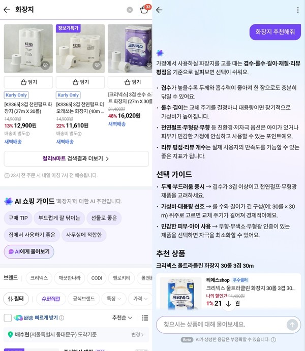 AI에게 물어보기를 통해 '화장지 추천해줘'를 입력하자 상품 상세 정보, 리뷰, 관련 문서 등을 AI가 분석해준다. 이용자의 선택 기준이 가장 높은 항목을 세분화해 더욱 편리한 상품 선택을 고를 수 있도록 선택 가이드가 안내된다. 화장지에는 겹수·두께 롤 길이·수량 무향·무형광·무색소 리뷰 평점·구매후기 가격 대비 가치 등으로 가이드를 제시해줬다.