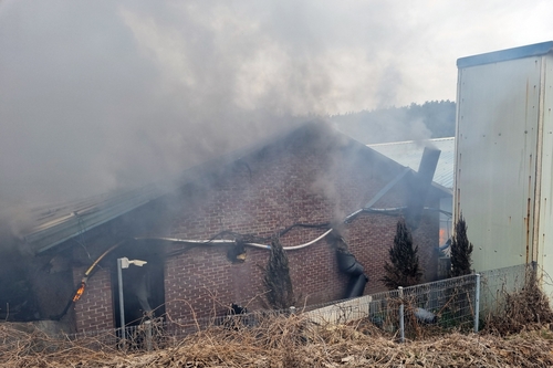 (무안=연합뉴스) 정회성 기자 = 1일 오후 2시 53분께 전남 무안군 청계면 한 돼지 축사에서 불이 났다.
