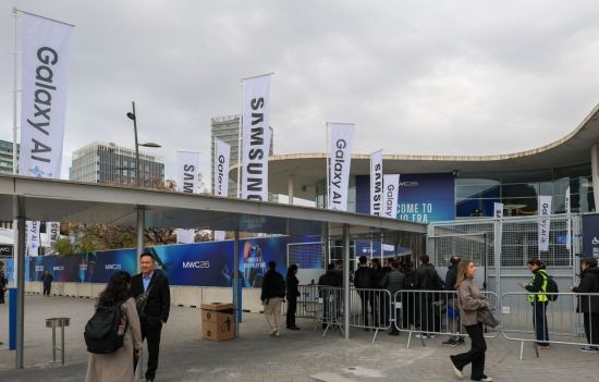 모바일 월드 콩그레스(MWC)2026 개막을 앞둔 1일(현지시간) 스페인 바르셀로나 피란 그란 비아 전시장 입구에 삼성전자 갤럭시 AI 홍보 깃발이 설치돼 있다.