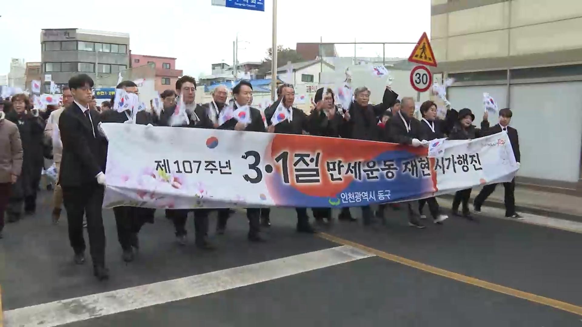 인천 창영초등학교에서 열린 3·1절 재현행사에는 1천여명의 시민들이 당시 쓰였던 '진관사 태극기'를 선두로 거리행진에 동참했습니다.